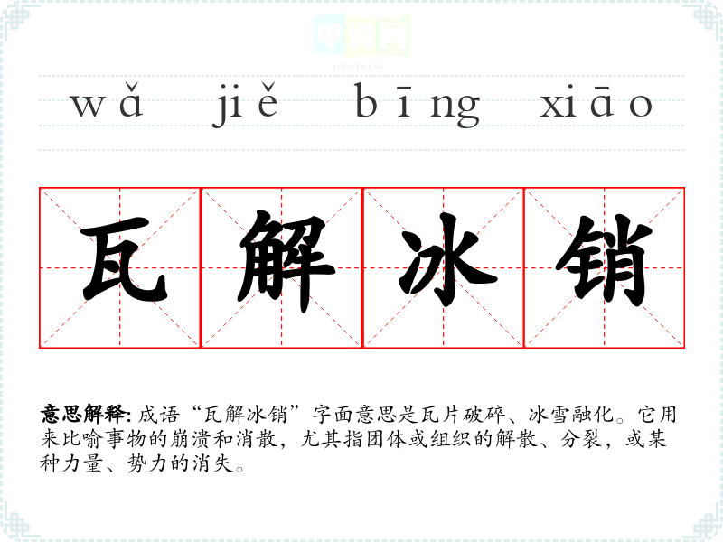 “瓦解冰销”反映了事物的脆弱和变幻,特别适用于描述历史变迁、社会动荡等现象。在现代社会中,这一成语依然适用,尤其在描述企业、团队的变革与挑战时,能引起人们的共鸣。