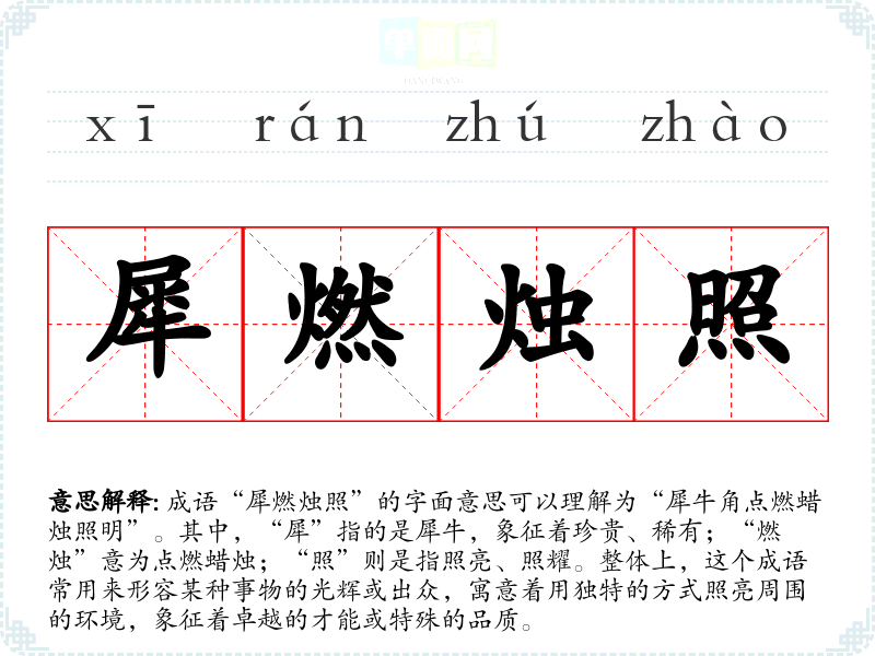 成语“犀燃烛照”的字面意思可以理解为“犀牛角点燃蜡烛照明”。其中,“犀”指的是犀牛,象征着珍贵、稀有;“燃烛”意为点燃蜡烛;“照”则是指照亮、照耀。整体上,这个成语常用来形容某种事物的光辉或出众,寓意着用独特的方式照亮周围的环境,象征着卓越的才能或特殊的品质。