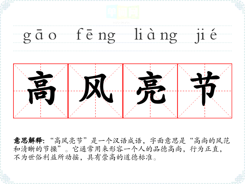 “高风亮节”是一个汉语成语,字面意思是“高尚的风范和清晰的节操”。它通常用来形容一个人的品德高尚,行为正直,不为世俗利益所动摇,具有崇高的道德标准。