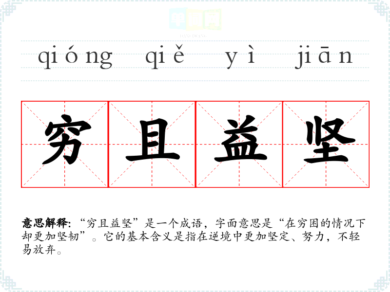 “穷且益坚”是一个成语,字面意思是“在穷困的情况下却更加坚韧”。它的基本含义是指在逆境中更加坚定、努力,不轻易放弃。