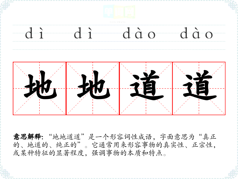“地地道道”是一个形容词性成语,字面意思为“真正的、地道的、纯正的”。它通常用来形容事物的真实性、正宗性,或某种特征的显著程度,强调事物的本质和特点。