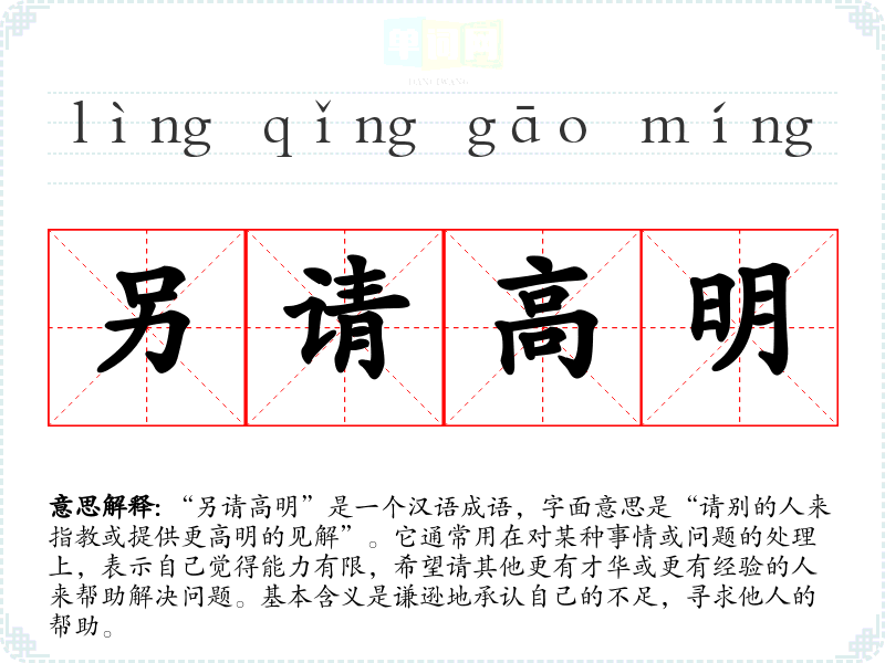 “另请高明”是一个汉语成语,字面意思是“请别的人来指教或提供更高明的见解”。它通常用在对某种事情或问题的处理上,表示自己觉得能力有限,希望请其他更有才华或更有经验的人来帮助解决问题。基本含义是谦逊地承认自己的不足,寻求他人的帮助。