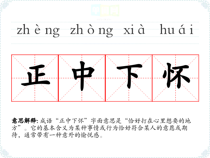 成语“正中下怀”字面意思是“恰好打在心里想要的地方”。它的基本含义为某种事情或行为恰好符合某人的意愿或期待,通常带有一种意外的愉悦感。
