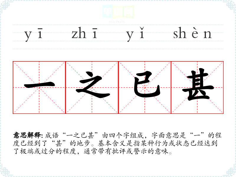成语“一之已甚”由四个字组成,字面意思是“一”的程度已经到了“甚”的地步。基本含义是指某种行为或状态已经达到了极端或过分的程度,通常带有批评或警示的意味。
