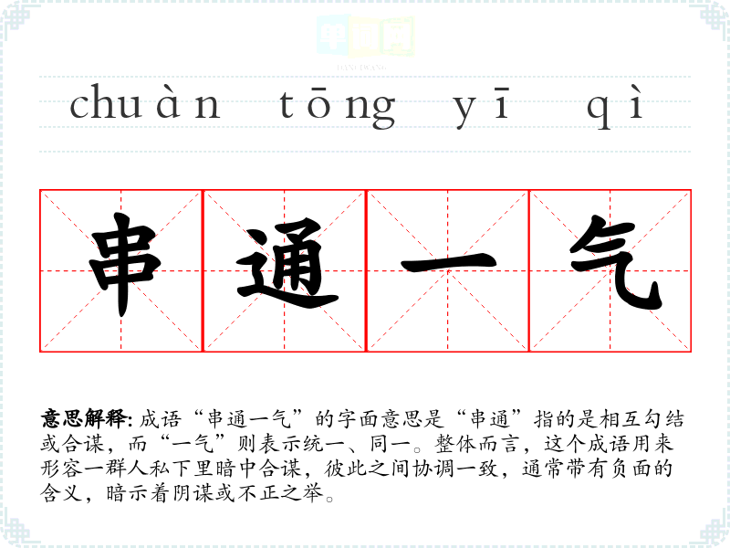 成语“串通一气”的字面意思是“串通”指的是相互勾结或合谋,而“一气”则表示统一、同一。整体而言,这个成语用来形容一群人私下里暗中合谋,彼此之间协调一致,通常带有负面的含义,暗示着阴谋或不正之举。