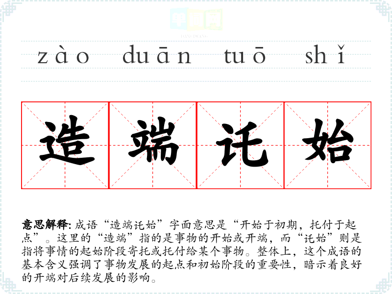 成语“造端讬始”字面意思是“开始于初期,托付于起点”。这里的“造端”指的是事物的开始或开端,而“讬始”则是指将事情的起始阶段寄托或托付给某个事物。整体上,这个成语的基本含义强调了事物发展的起点和初始阶段的重要性,暗示着良好的开端对后续发展的影响。