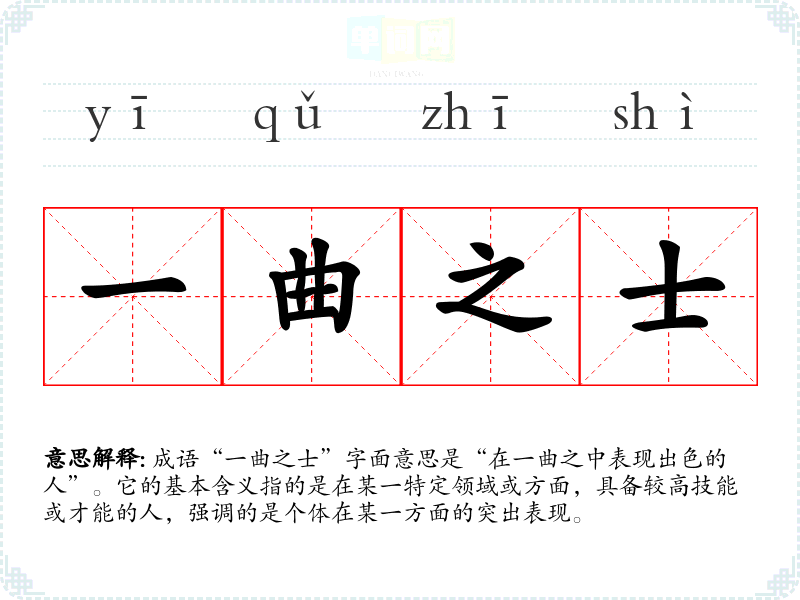 成语“一曲之士”字面意思是“在一曲之中表现出色的人”。它的基本含义指的是在某一特定领域或方面,具备较高技能或才能的人,强调的是个体在某一方面的突出表现。