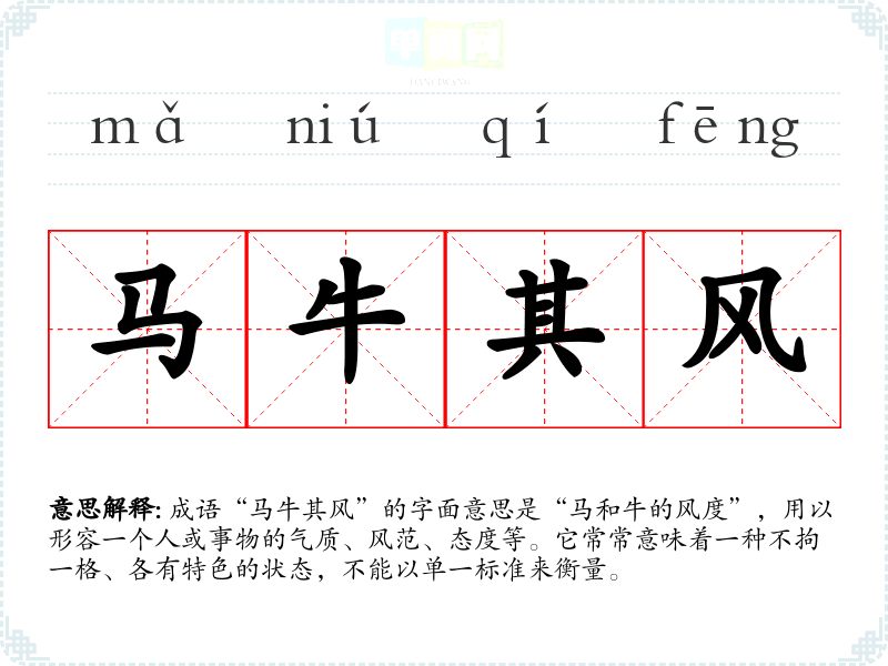 成语“马牛其风”的字面意思是“马和牛的风度”,用以形容一个人或事物的气质、风范、态度等。它常常意味着一种不拘一格、各有特色的状态,不能以单一标准来衡量。