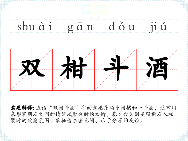 成语“双柑斗酒”字面意思是两个柑橘和一斗酒,通常用来形容朋友之间的情谊或聚会时的欢愉。基本含义则是强调友人相聚时的欢愉氛围,象征着亲密无间、乐于分享的友谊。