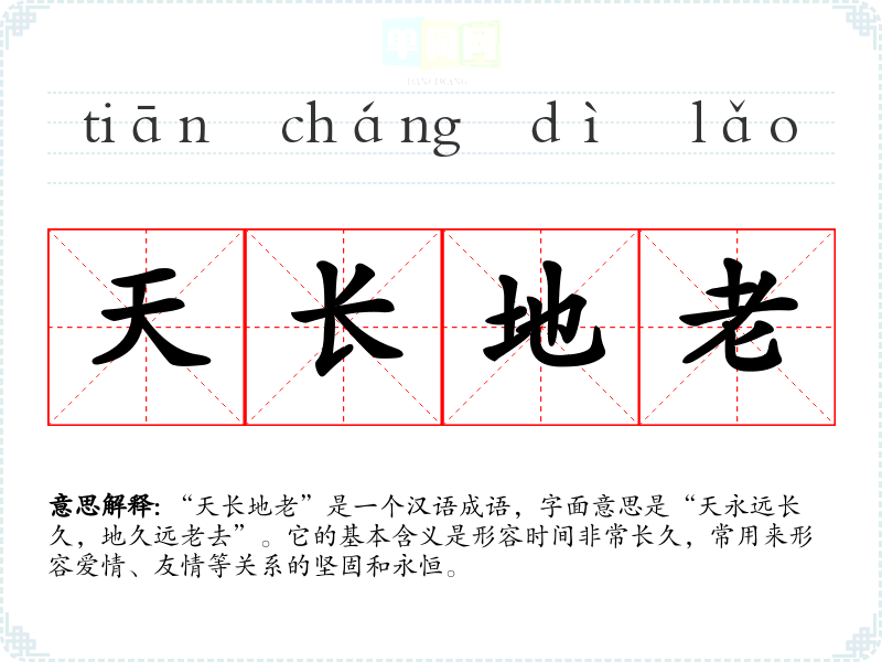 “天长地老”是一个汉语成语,字面意思是“天永远长久,地久远老去”。它的基本含义是形容时间非常长久,常用来形容爱情、友情等关系的坚固和永恒。
