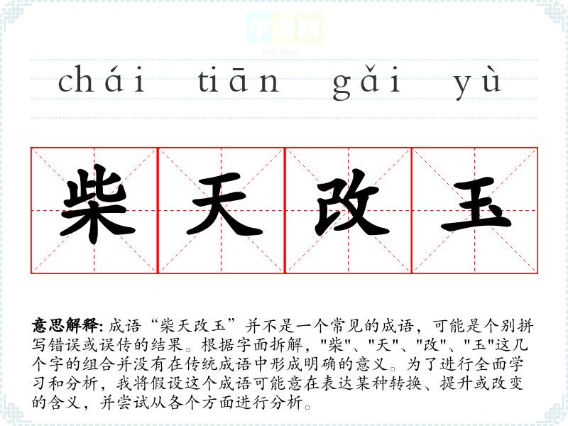 成语“柴天改玉”并不是一个常见的成语,可能是个别拼写错误或误传的结果。根据字面拆解,"柴"、"天"、"改"、"玉"这几个字的组合并没有在传统成语中形成明确的意义。为了进行全面学习和分析,我将假设这个成语可能意在表达某种转换、提升或改变的含义,并尝试从各个方面进行分析。