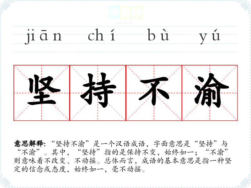 “坚持不渝”是一个汉语成语,字面意思是“坚持”与“不渝”。其中,“坚持”指的是保持不变,始终如一;“不渝”则意味着不改变、不动摇。总体而言,成语的基本意思是指一种坚定的信念或态度,始终如一,毫不动摇。