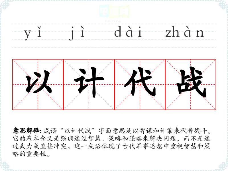 成语“以计代战”字面意思是以智谋和计策来代替战斗。它的基本含义是强调通过智慧、策略和谋略来解决问题,而不是通过武力或直接冲突。这一成语体现了古代军事思想中重视智慧和策略的重要性。