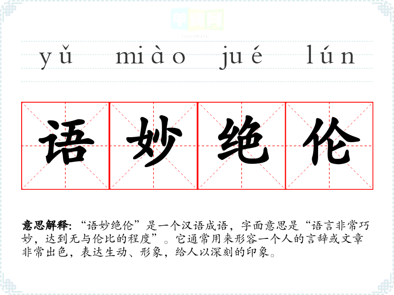 “语妙绝伦”是一个汉语成语,字面意思是“语言非常巧妙,达到无与伦比的程度”。它通常用来形容一个人的言辞或文章非常出色,表达生动、形象,给人以深刻的印象。