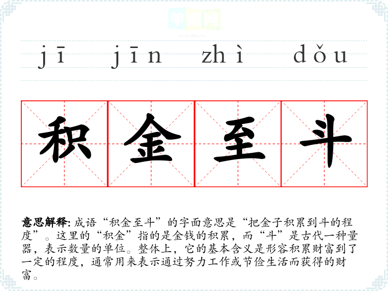成语“积金至斗”的字面意思是“把金子积累到斗的程度”。这里的“积金”指的是金钱的积累,而“斗”是古代一种量器,表示数量的单位。整体上,它的基本含义是形容积累财富到了一定的程度,通常用来表示通过努力工作或节俭生活而获得的财富。