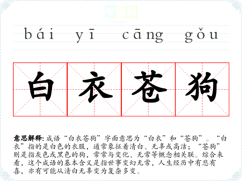 成语“白衣苍狗”字面意思为“白衣”和“苍狗”。“白衣”指的是白色的衣服,通常象征着清白、无辜或高洁;“苍狗”则是指灰色或黑色的狗,常常与变化、无常等概念相关联。综合来看,这个成语的基本含义是指世事变幻无常,人生经历中有悲有喜,亦有可能从清白无辜变为复杂多变。