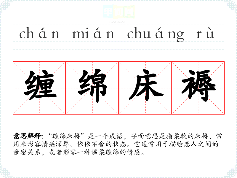 “缠绵床褥”是一个成语,字面意思是指柔软的床褥,常用来形容情感深厚、依依不舍的状态。它通常用于描绘恋人之间的亲密关系,或者形容一种温柔缠绵的情感。