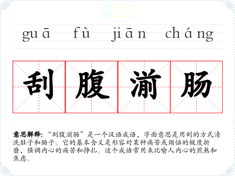 “刮腹湔肠”是一个汉语成语,字面意思是用刮的方式清洗肚子和肠子。它的基本含义是形容对某种痛苦或烦恼的极度折磨,强调内心的痛苦和挣扎。这个成语常用来比喻人内心的煎熬和焦虑。