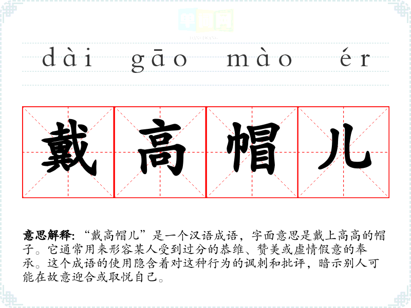 “戴高帽儿”是一个汉语成语,字面意思是戴上高高的帽子。它通常用来形容某人受到过分的恭维、赞美或虚情假意的奉承。这个成语的使用隐含着对这种行为的讽刺和批评,暗示别人可能在故意迎合或取悦自己。