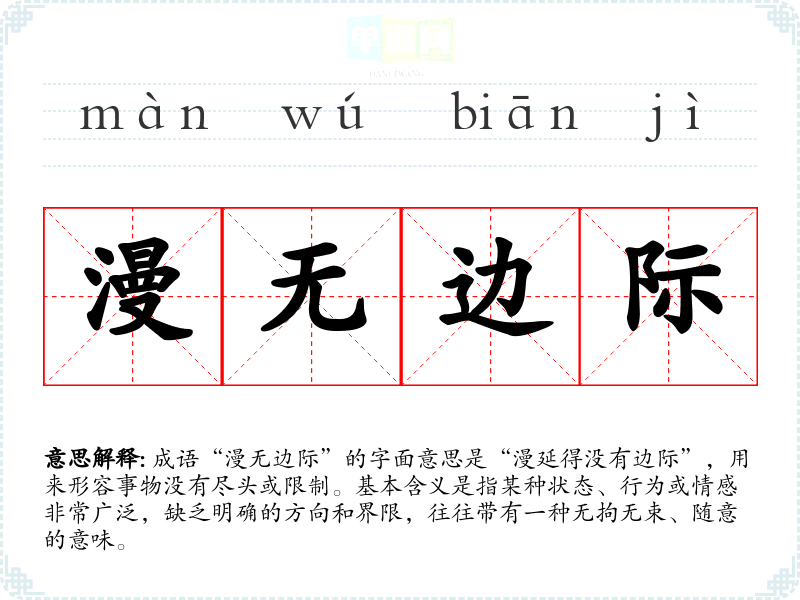 成语“漫无边际”的字面意思是“漫延得没有边际”,用来形容事物没有尽头或限制。基本含义是指某种状态、行为或情感非常广泛,缺乏明确的方向和界限,往往带有一种无拘无束、随意的意味。