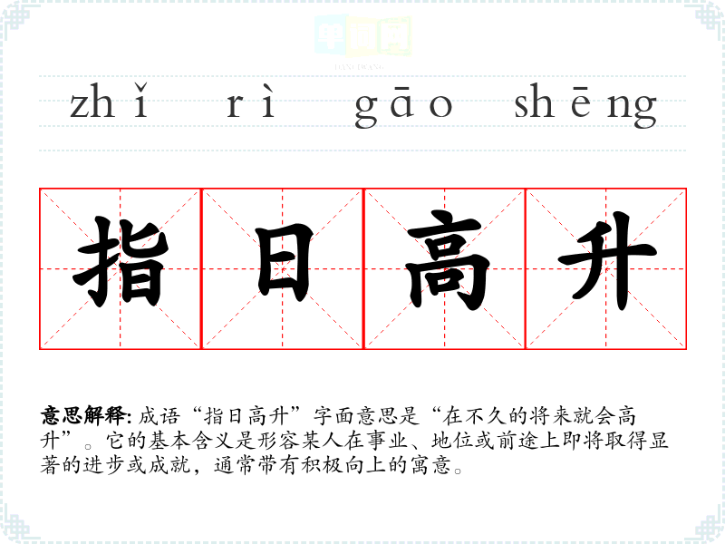 成语“指日高升”字面意思是“在不久的将来就会高升”。它的基本含义是形容某人在事业、地位或前途上即将取得显著的进步或成就,通常带有积极向上的寓意。