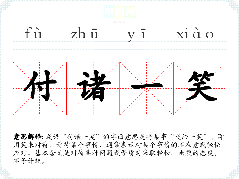 成语“付诸一笑”的字面意思是将某事“交给一笑”,即用笑来对待、看待某个事情,通常表示对某个事情的不在意或轻松应对。基本含义是对待某种问题或矛盾时采取轻松、幽默的态度,不予计较。