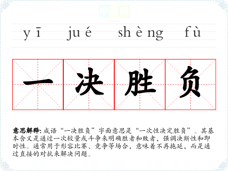 成语“一决胜负”字面意思是“一次性决定胜负”。其基本含义是通过一次较量或斗争来明确胜者和败者,强调决断性和即时性。通常用于形容比赛、竞争等场合,意味着不再拖延,而是通过直接的对抗来解决问题。