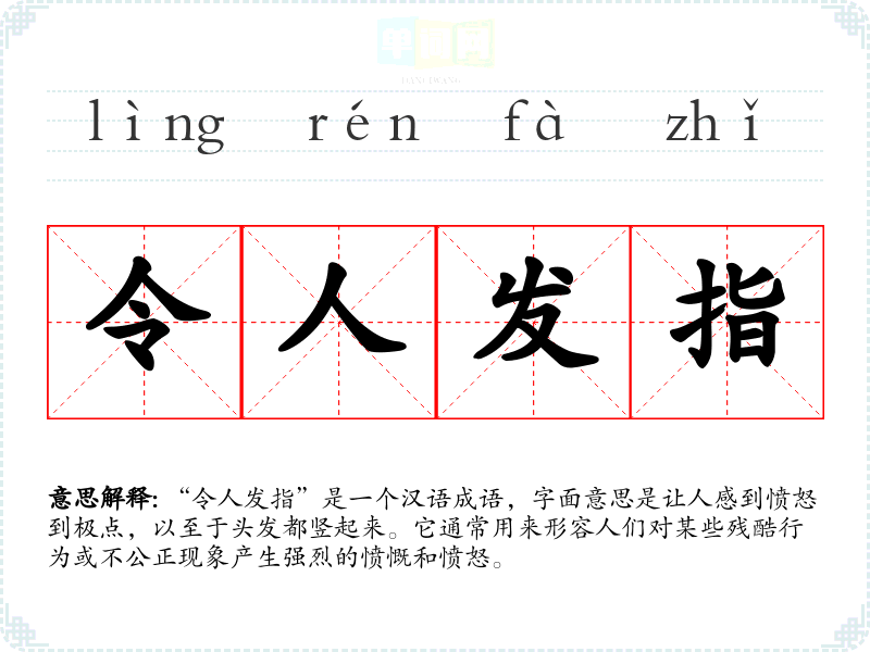 “令人发指”是一个汉语成语,字面意思是让人感到愤怒到极点,以至于头发都竖起来。它通常用来形容人们对某些残酷行为或不公正现象产生强烈的愤慨和愤怒。