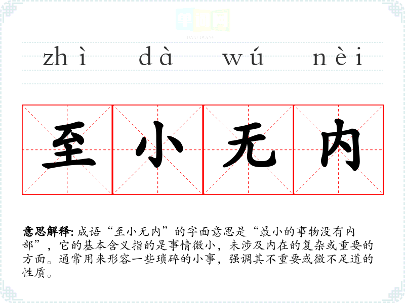 成语“至小无内”的字面意思是“最小的事物没有内部”,它的基本含义指的是事情微小,未涉及内在的复杂或重要的方面。通常用来形容一些琐碎的小事,强调其不重要或微不足道的性质。