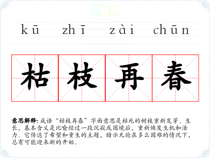 成语“枯枝再春”字面意思是枯死的树枝重新发芽、生长,基本含义是比喻经过一段沉寂或困境后,重新焕发生机和活力。它传达了希望和重生的主题,暗示无论在多么困难的情况下,总有可能迎来新的开始。