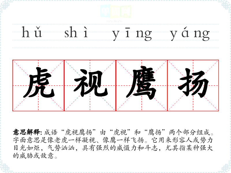 成语“虎视鹰扬”由“虎视”和“鹰扬”两个部分组成。字面意思是像**一样凝视、像鹰一样飞扬。它用来形容人或势力目光如炬,气势汹汹,具有强烈的威慑力和斗志,尤其指某种强大的威胁或敌意。