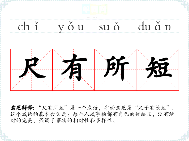 “尺有所短”是一个成语,字面意思是“尺子有长短”。这个成语的基本含义是:每个人或事物都有自己的优缺点,没有绝对的完美,强调了事物的相对性和多样性。