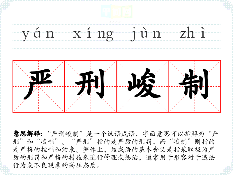 | 严刑峻制 | 犹言严刑峻法。严厉的刑罚和严峻的法令。 |