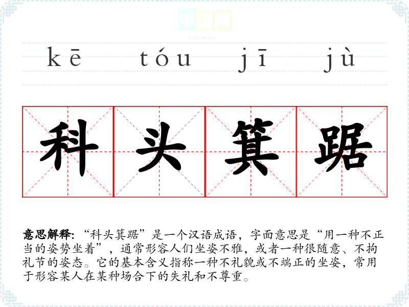 “科头箕踞”是一个汉语成语,字面意思是“用一种不正当的姿势坐着”,通常形容人们坐姿不雅,或者一种很随意、不拘礼节的姿态。它的基本含义指称一种不礼貌或不端正的坐姿,常用于形容某人在某种场合下的失礼和不尊重。