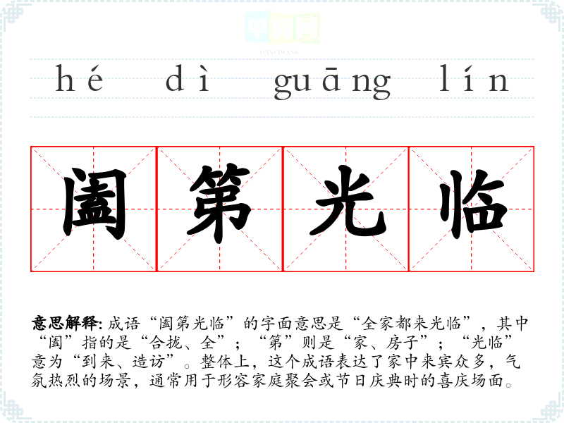成语“阖第光临”的字面意思是“全家都来光临”,其中“阖”指的是“合拢、全”;“第”则是“家、房子”;“光临”意为“到来、造访”。整体上,这个成语表达了家中来宾众多,气氛热烈的场景,通常用于形容家庭聚会或节日庆典时的喜庆场面。