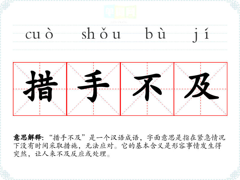 “措手不及”是一个汉语成语,字面意思是指在紧急情况下没有时间采取措施,无法应对。它的基本含义是形容事情发生得突然,让人来不及反应或处理。