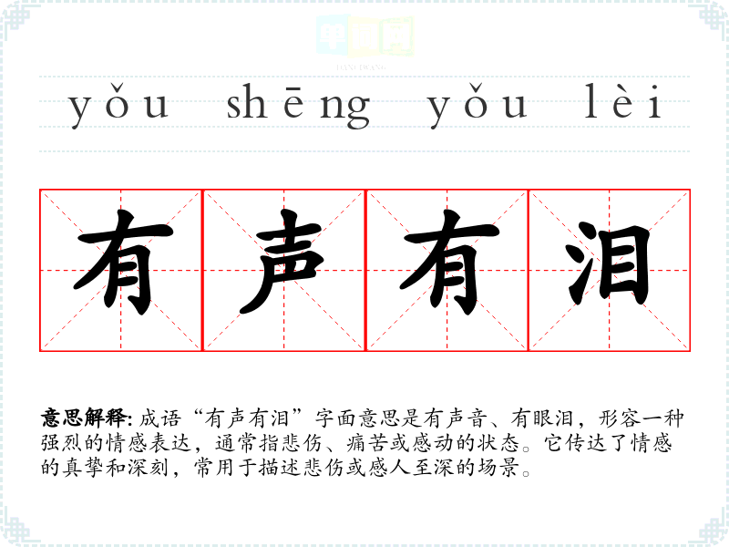成语“有声有泪”字面意思是有声音、有眼泪,形容一种强烈的情感表达,通常指悲伤、痛苦或感动的状态。它传达了情感的真挚和深刻,常用于描述悲伤或感人至深的场景。