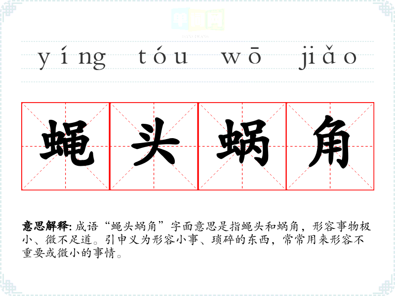 成语“蝇头蜗角”字面意思是指蝇头和蜗角,形容事物极小、微不足道。引申义为形容小事、琐碎的东西,常常用来形容不重要或微小的事情。