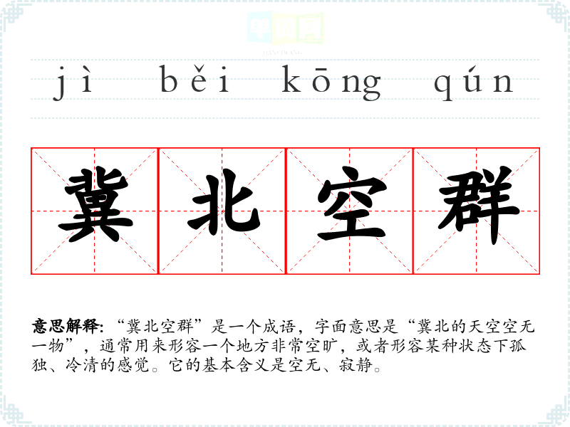 “冀北空群”是一个成语,字面意思是“冀北的天空空无一物”,通常用来形容一个地方非常空旷,或者形容某种状态下孤独、冷清的感觉。它的基本含义是空无、寂静。
