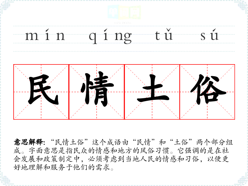 “民情土俗”这个成语由“民情”和“土俗”两个部分组成。字面意思是指民众的情感和地方的风俗惯。它强调的是在社会发展和政策制定中,必须考虑到当地人民的情感和俗,以便更好地理解和服务于他们的需求。