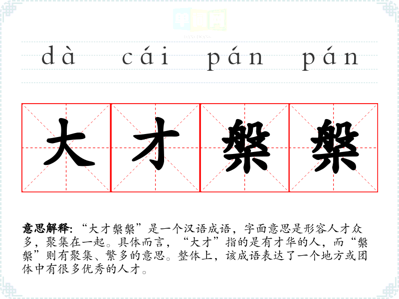 “大才槃槃”是一个汉语成语,字面意思是形容人才众多,聚集在一起。具体而言,“大才”指的是有才华的人,而“槃槃”则有聚集、繁多的意思。整体上,该成语表达了一个地方或团体中有很多优秀的人才。