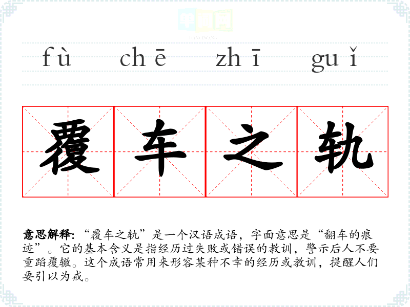 “覆车之轨”是一个汉语成语,字面意思是“翻车的痕迹”。它的基本含义是指经历过失败或错误的教训,警示后人不要重蹈覆辙。这个成语常用来形容某种不幸的经历或教训,提醒人们要引以为戒。