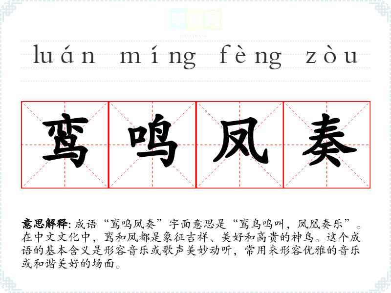 成语“鸾鸣凤奏”字面意思是“鸾鸟鸣叫,凤凰奏乐”。在中文文化中,鸾和凤都是象征吉祥、美好和高贵的神鸟。这个成语的基本含义是形容音乐或歌声美妙动听,常用来形容优雅的音乐或和谐美好的场面。
