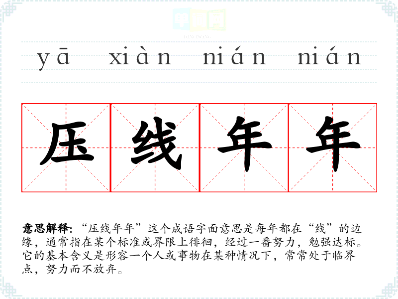 “压线年年”这个成语字面意思是每年都在“线”的边缘,通常指在某个标准或界限上徘徊,经过一番努力,勉强达标。它的基本含义是形容一个人或事物在某种情况下,常常处于临界点,努力而不放弃。