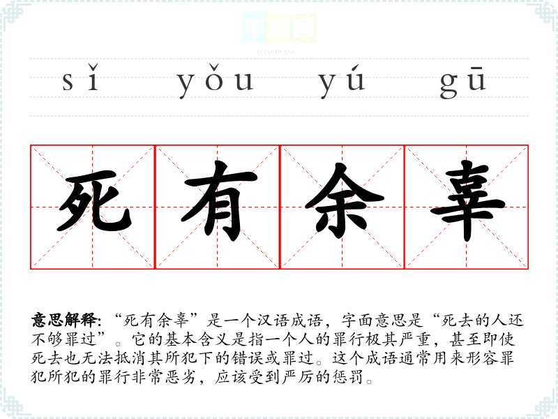 | 死有余辜 | 辜:罪。形容罪大恶极,即使处死刑也抵偿不了他的罪恶。 |
