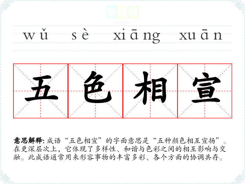 成语“五色相宣”的字面意思是“五种颜色相互宣扬”。在更深层次上,它体现了多样性、和谐与色彩之间的相互影响与交融。此成语通常用来形容事物的丰富多彩、各个方面的协调共存。