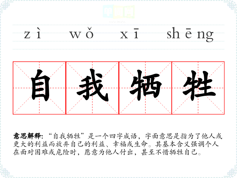 “自我牺牲”是一个四字成语,字面意思是指为了他人或更大的利益而放弃自己的利益、幸福或生命。其基本含义强调个人在面对困难或危险时,愿意为他人付出,甚至不惜牺牲自己。