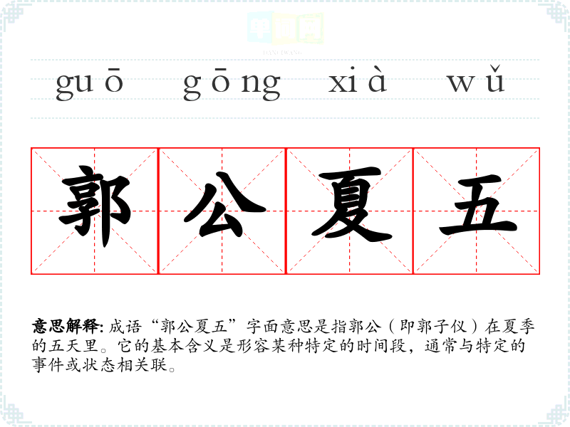 成语“郭公夏五”字面意思是指郭公(即郭子仪)在夏季的五天里。它的基本含义是形容某种特定的时间段,通常与特定的**或状态相关联。