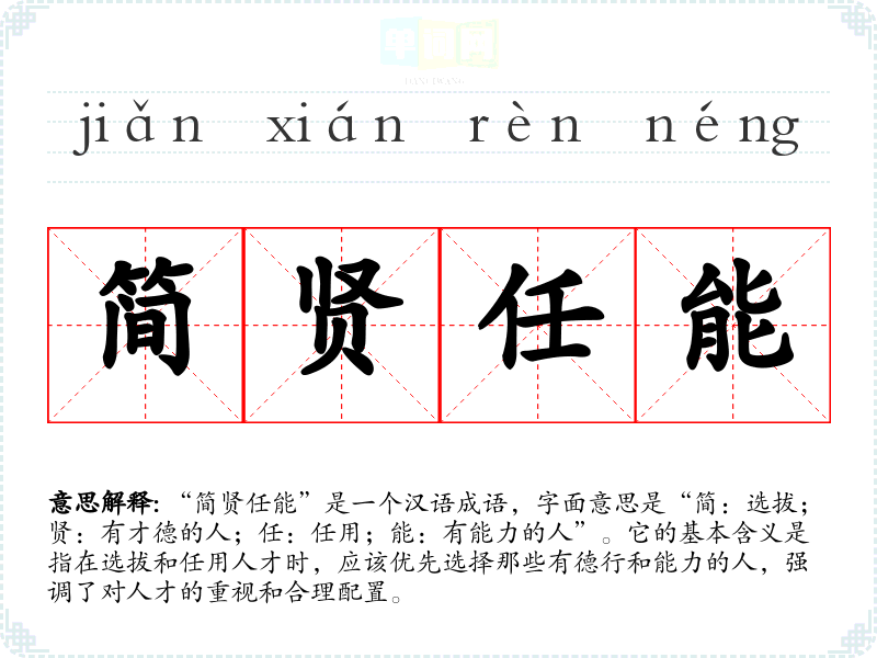 “简贤任能”是一个汉语成语,字面意思是“简:选拔;贤:有才德的人;任:任用;能:有能力的人”。它的基本含义是指在选拔和任用人才时,应该优先选择那些有德行和能力的人,强调了对人才的重视和合理配置。