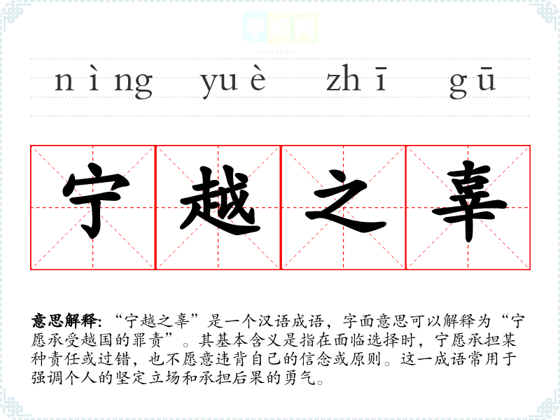 “宁越之辜”是一个汉语成语,字面意思可以解释为“宁愿承受越国的罪责”。其基本含义是指在面临选择时,宁愿承担某种责任或过错,也不愿意违背自己的信念或原则。这一成语常用于强调个人的坚定立场和承担后果的勇气。